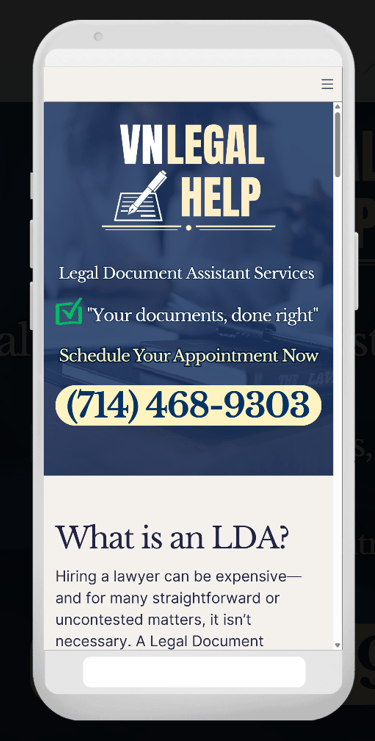 Our website is designed to be bilingual (English–Vietnamese), simple, clear, and user-friendly. The homepage allows visitors to scroll smoothly through all essential information, including explanations of what an LDA is, when an LDA is the right choice, and when hiring a lawyer may be necessary. This structure helps users quickly understand their options and make informed decisions with confidence.